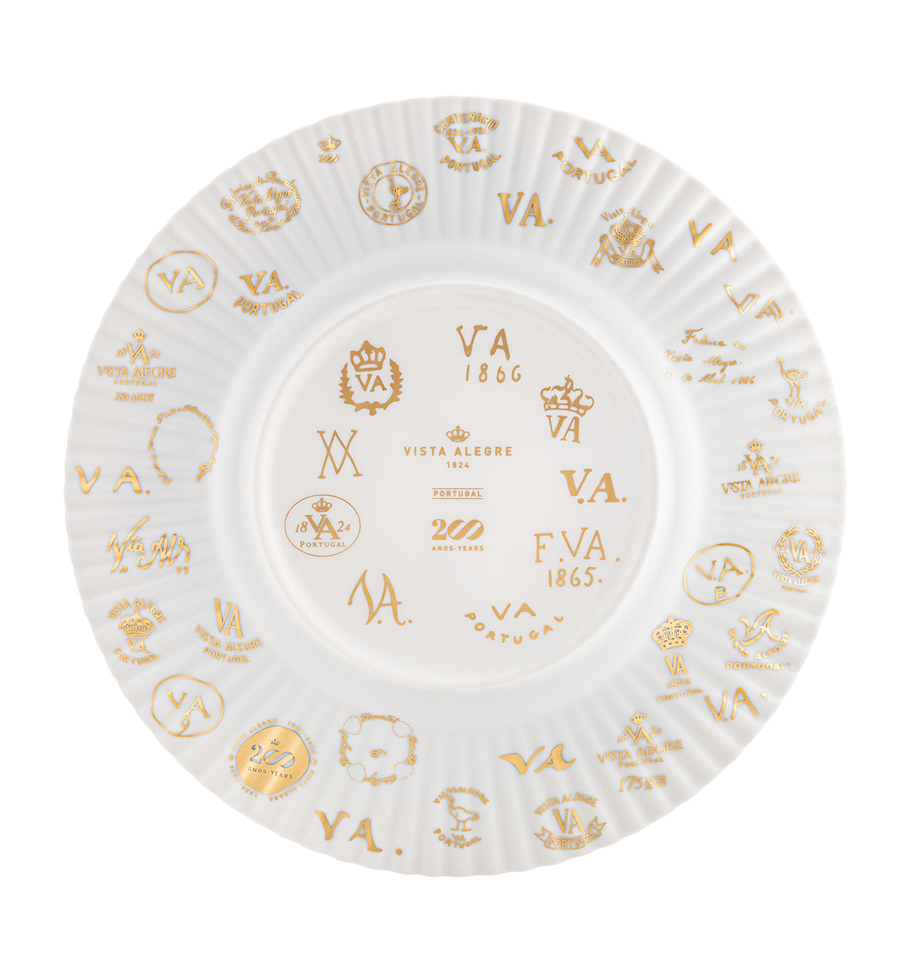 200 Anos reflects Vista Alegre’s constant capacity for renewal, recreating a memory that is as much based on centenary know-how as it is on a dynamic vision of modernity. Combining various aesthetic elements from different eras in the brand’s history, this collection plays with corrugations and fluting, inspired by pieces from different eras in Vista Alegre’s collection. The different scales, which vary from piece to piece, result in a surprising intersection between past and future, reflecting Vista Alegre’s historical trajectory. Delicate matte gold filaments that emphasize the outline of the pieces guarantee their timeless character and prestige, accentuated by the presence of the evolution of the Vista Alegre logo on the back.