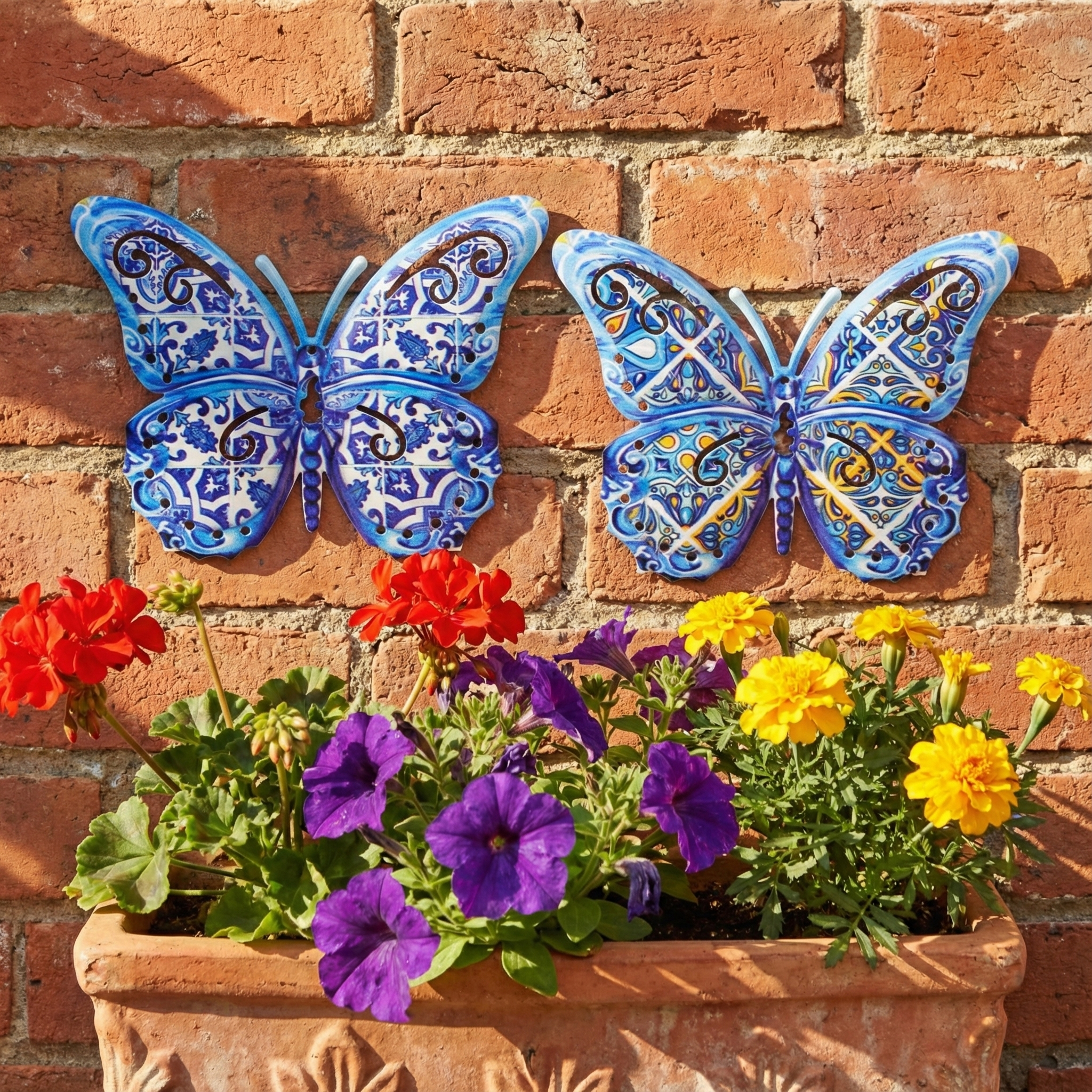 Bring a touch of Portugal to your home with these beautifully crafted metal butterflies featuring classic Azulejo tile designs. Lightweight, easy to hang, and available in two sizes, they make the perfect decorative accent for any wall, indoors or out. Their thin metal construction and intricate cutout details give each piece an elegant, airy look that brightens any space.