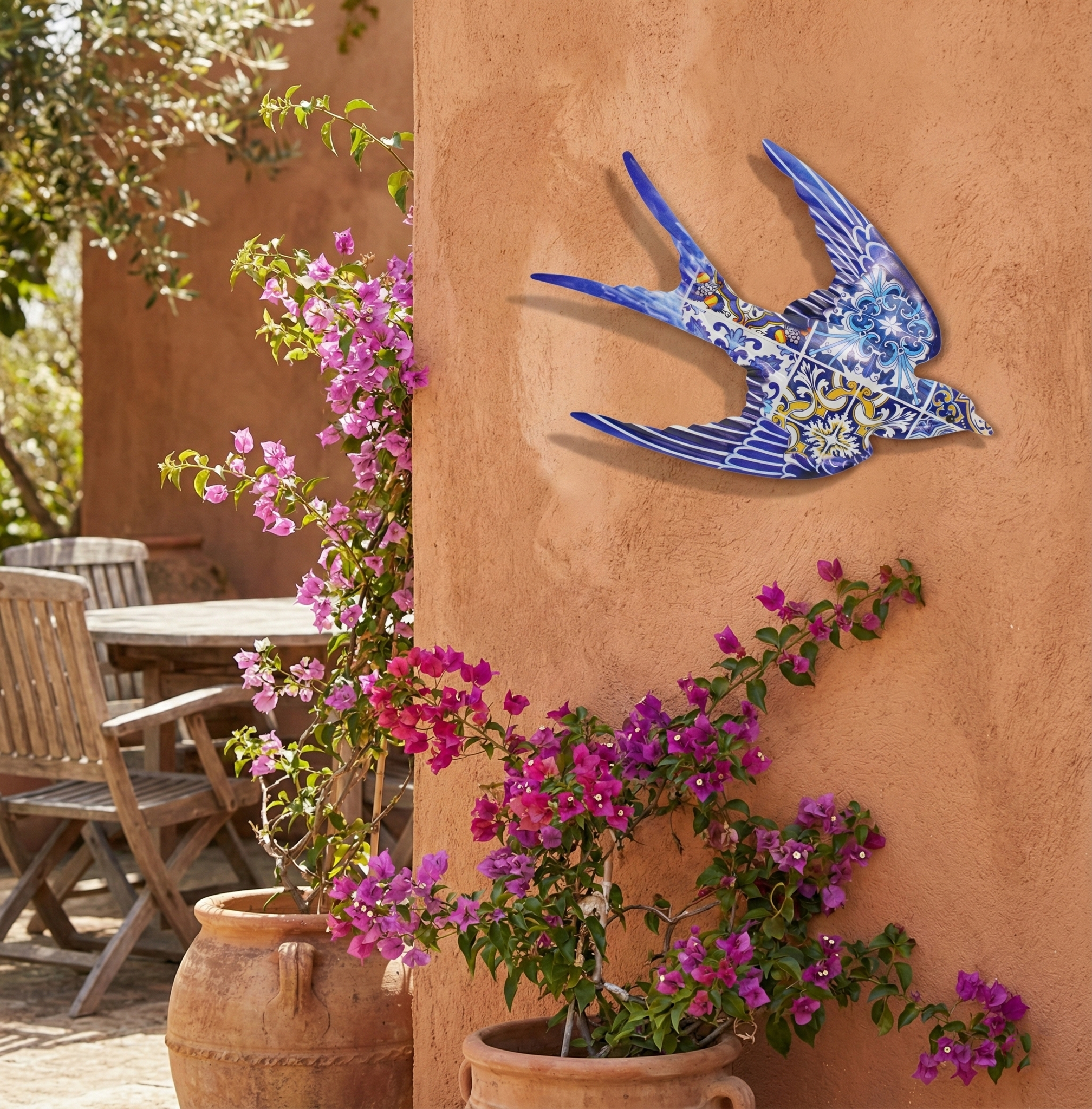 Bring bold Portuguese charm to your space with these XL Azulejo Metal Swallows. Crafted from lightweight metal and decorated with vibrant tile-inspired patterns, they hang easily and make a striking statement on any wall. Available in two beautiful designs, they’re perfect for indoor or outdoor décor.