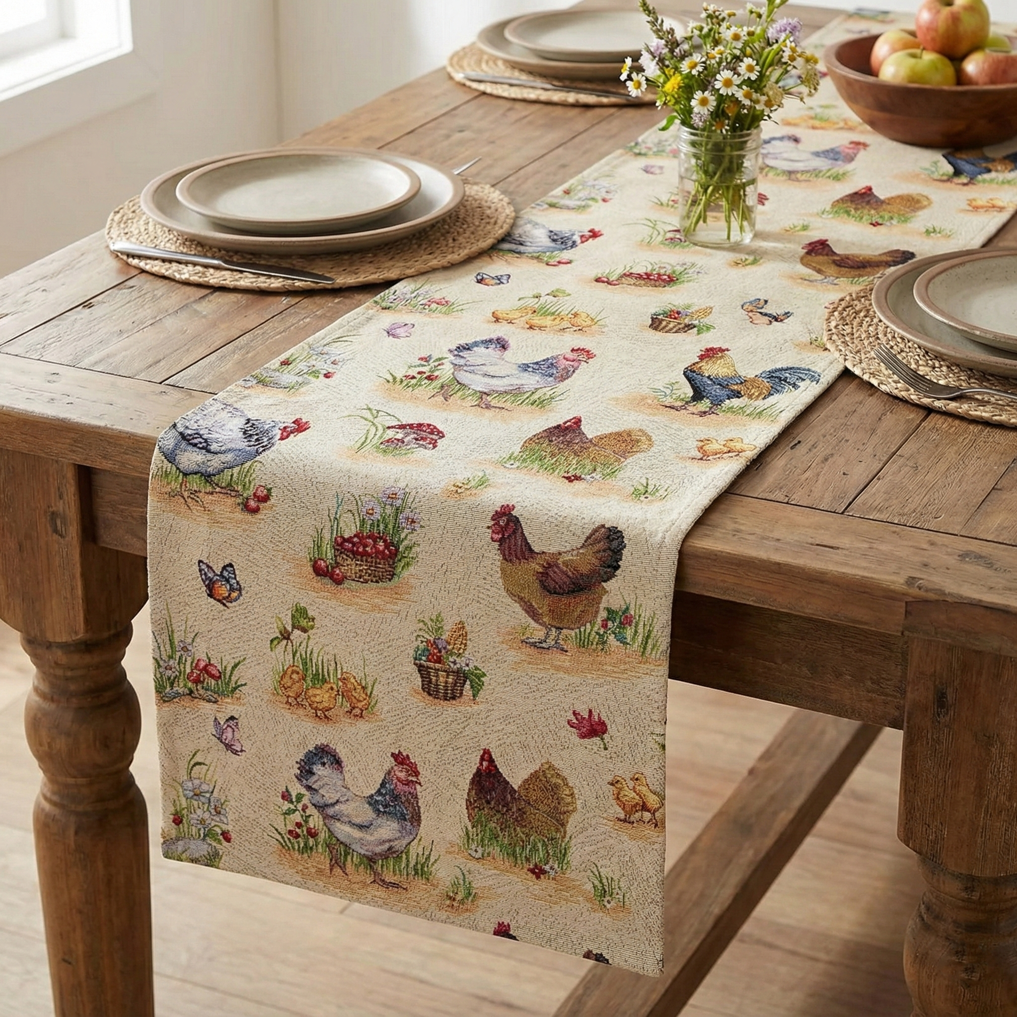 - Farmhouse Charm: Features a classic rooster and countryside pattern, perfect for adding character to dining tables, sideboards, buffets, or console tables.