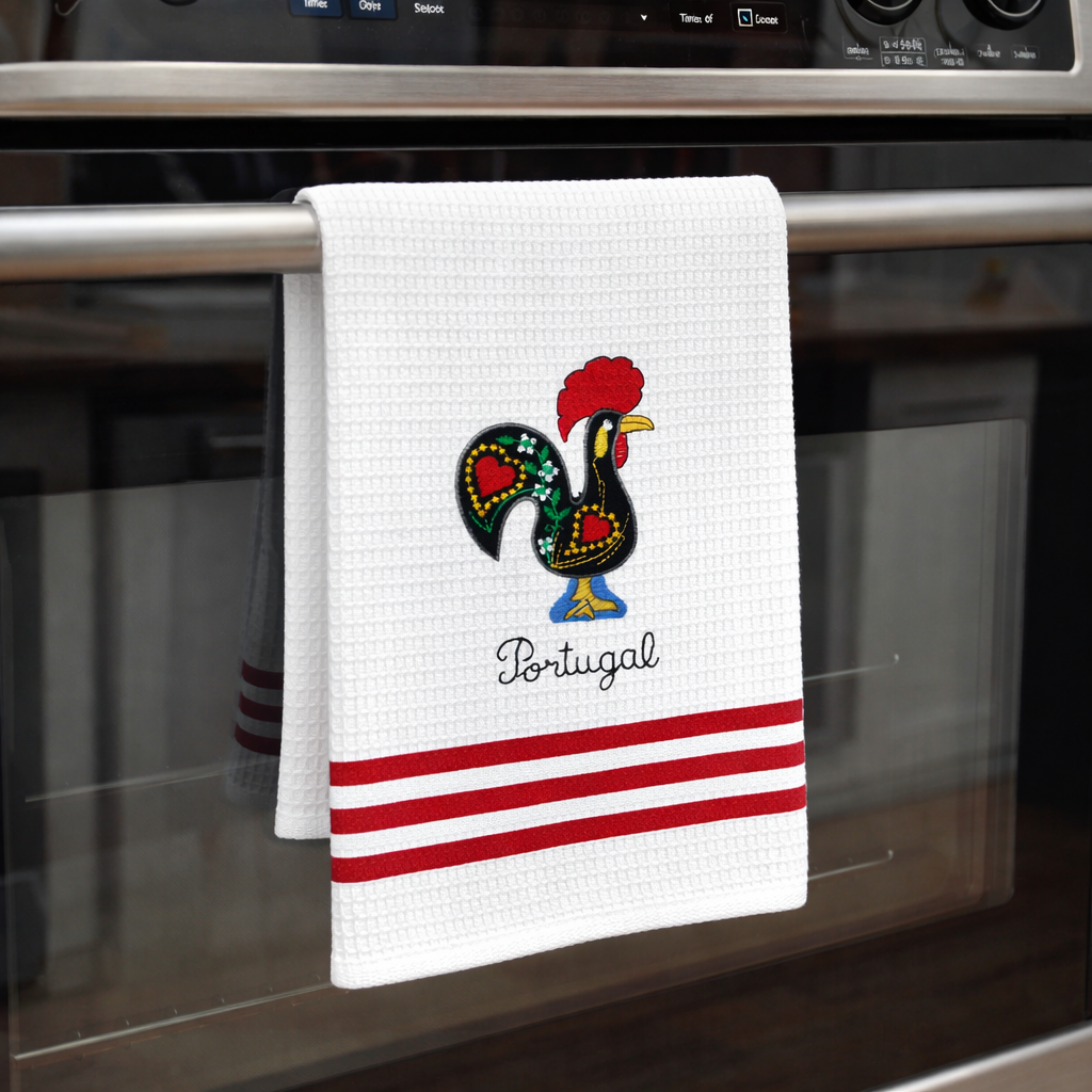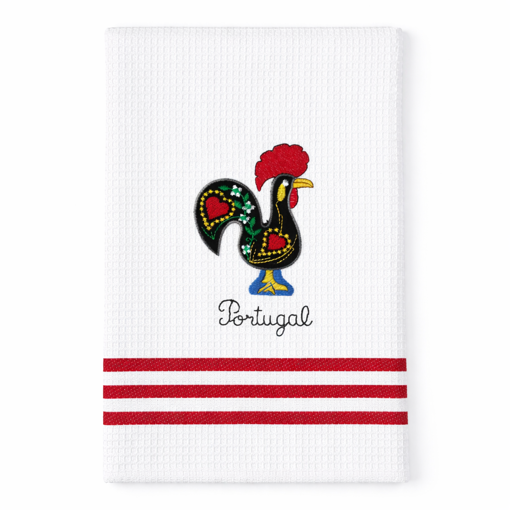 Featuring the iconic Barcelos rooster embroidered on a crisp white waffle-weave background, this design highlights the vibrant colors and rich heritage of Portuguese culture. The bold red stripe detail adds a classic, eye-catching accent reminiscent of traditional Portuguese kitchen textiles, while the textured cotton construction offers both decorative appeal and everyday functionality.