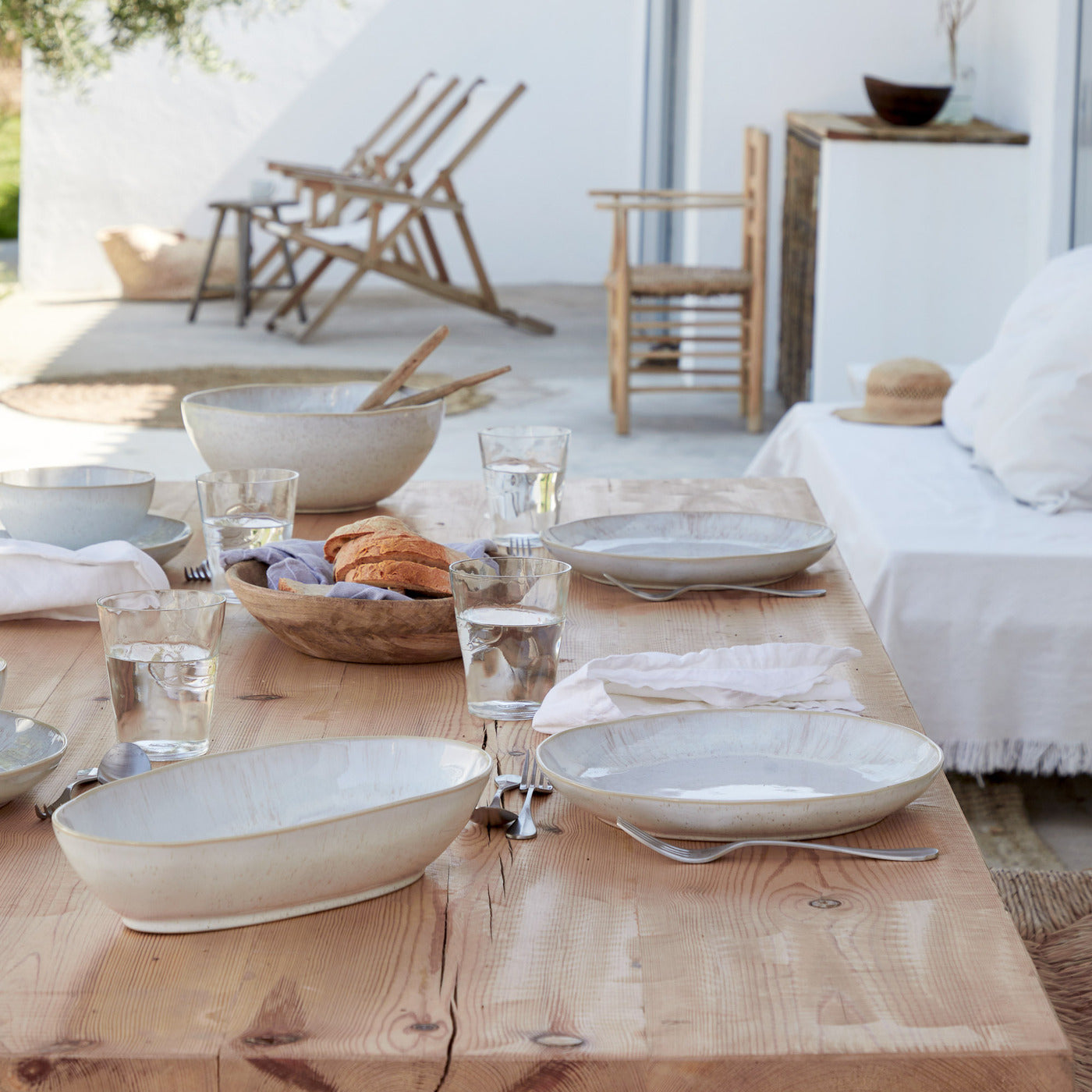 Discover Casafina's organic-shaped collection, Eivissa. The natural curves of the collection are enhanced by its artfully reactive glazes that create perfectly imperfect patterns of beige-sand and sea-blue on the interior. Eivissa showcases a striking interior finish, enhanced by a minimalistic white exterior. Organically-shaped and artfully glazed, no two pieces will ever look the same.