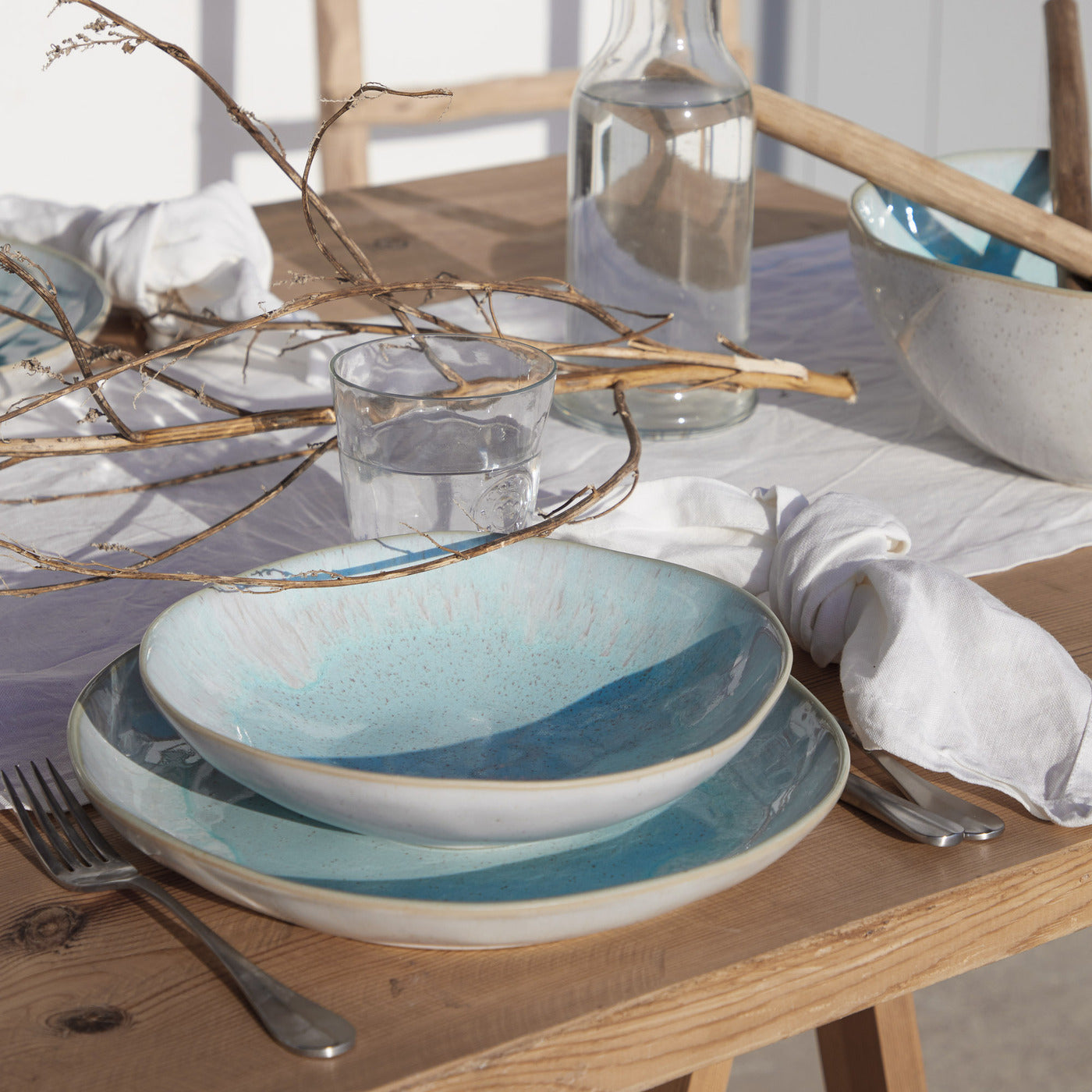 Discover Casafina's organic-shaped collection, Eivissa. The natural curves of the collection are enhanced by its artfully reactive glazes that create perfectly imperfect patterns of beige-sand and sea-blue on the interior. Eivissa showcases a striking interior finish, enhanced by a minimalistic white exterior. Organically-shaped and artfully glazed, no two pieces will ever look the same.