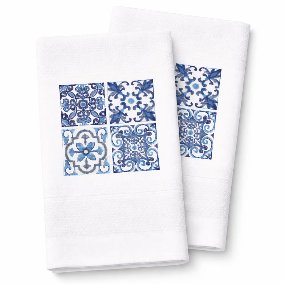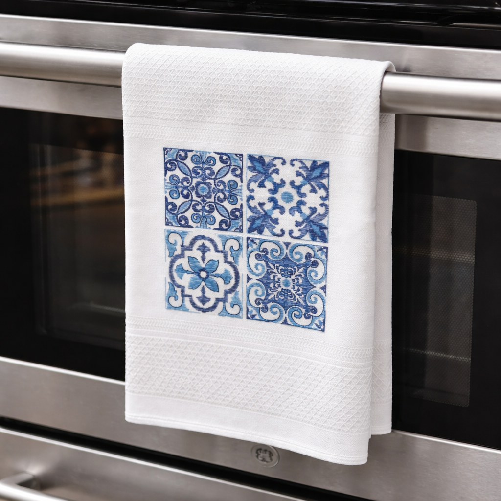 Featuring four classic blue and white azulejo-inspired tile designs, this towel reflects the rich artistic heritage found throughout Portugal’s architecture and design. The intricate patterns and cool tones create a refined and sophisticated look that complements both traditional and modern kitchens.