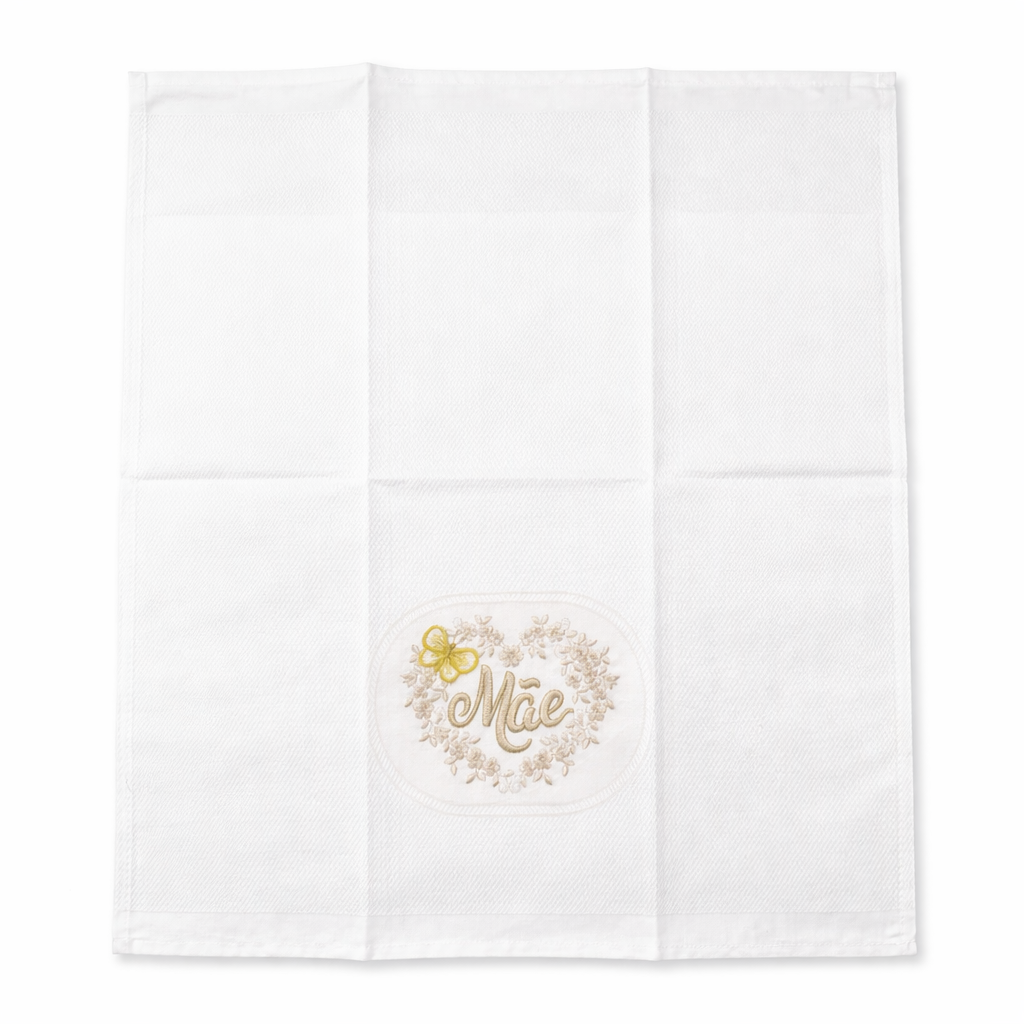 - “Mãe” Floral Embroidery Design: Features an elegant gold-tone embroidered script reading “Mãe” (Mother), beautifully framed by a delicate floral wreath with intricate vine and blossom details. A soft yellow butterfly accent adds a gentle, uplifting touch—symbolizing love, warmth, and appreciation for motherhood.