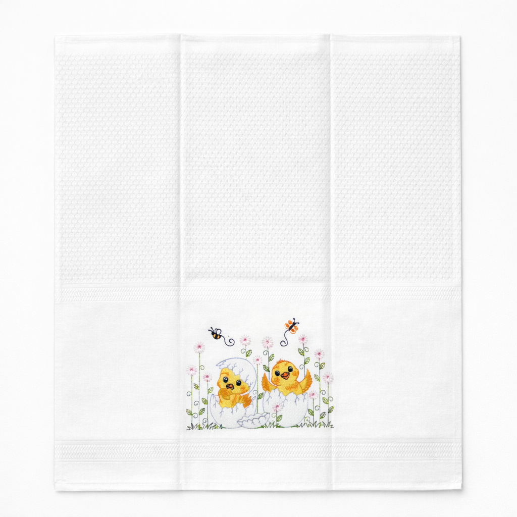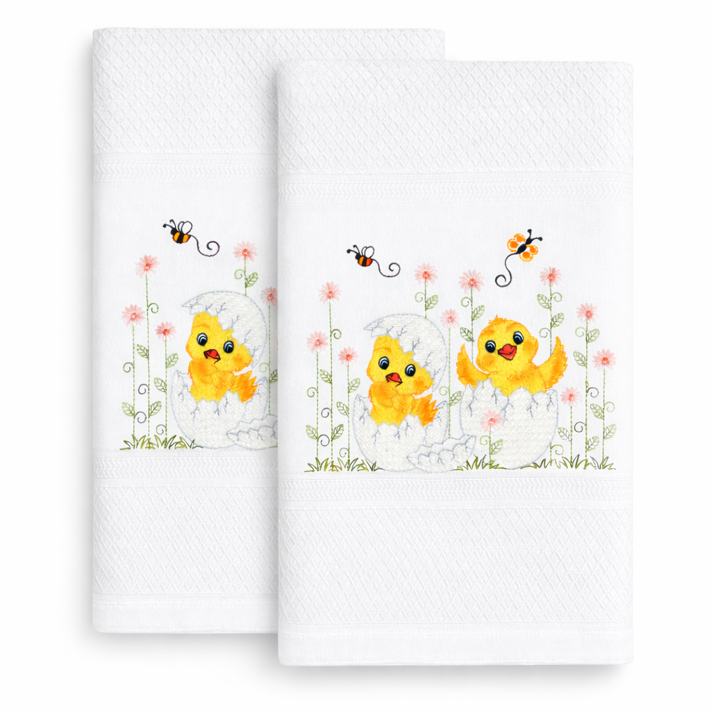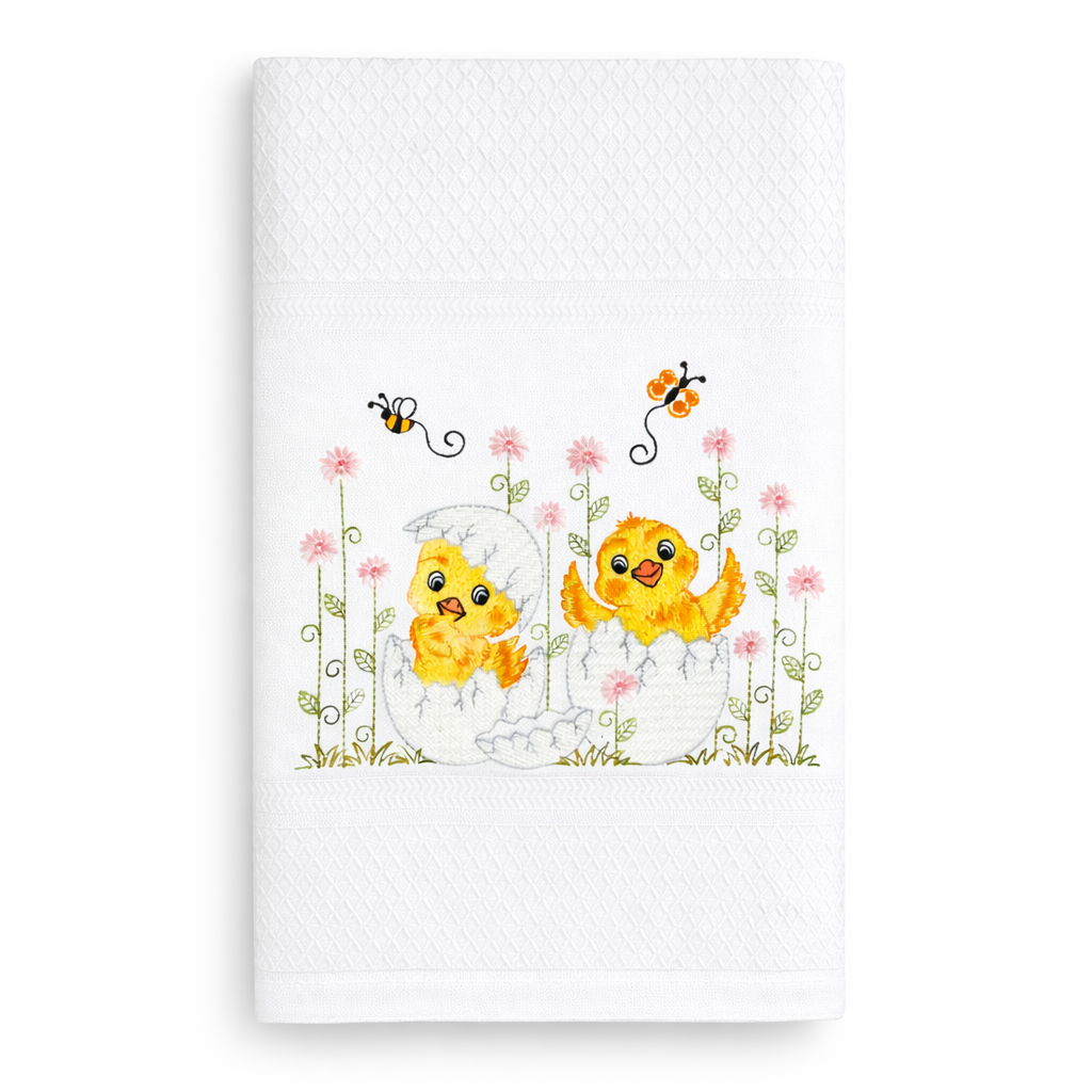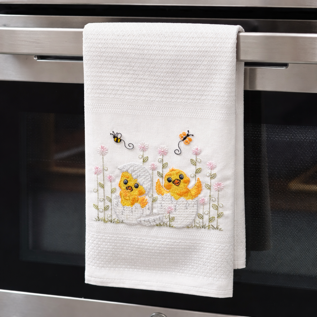 - Charming Embroidered Design: Features a beautifully detailed embroidered scene of spring chicks with delicate floral accents, adding a soft and cheerful touch to any kitchen.