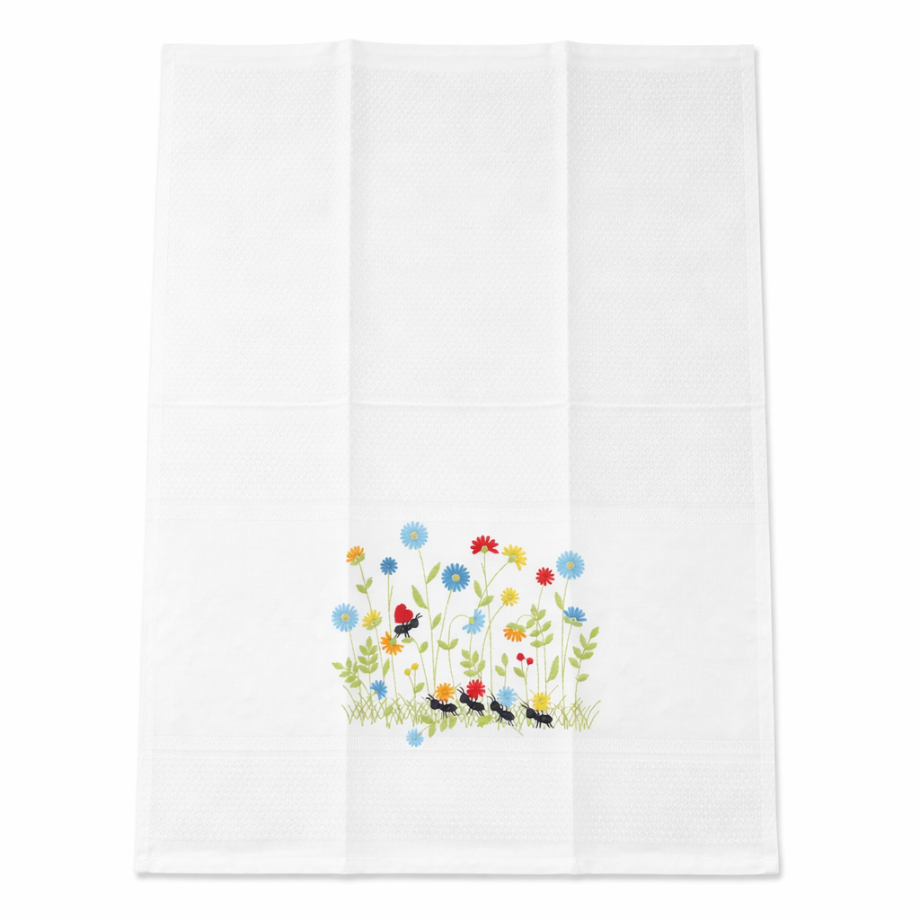 Featuring a delightful wildflower garden design with colorful blooms and intricately stitched ants, this towel captures a lighthearted and nature-inspired aesthetic. The soft yet vibrant embroidery stands out beautifully against the crisp white cotton background, creating a unique decorative accent that feels both cheerful and refined.