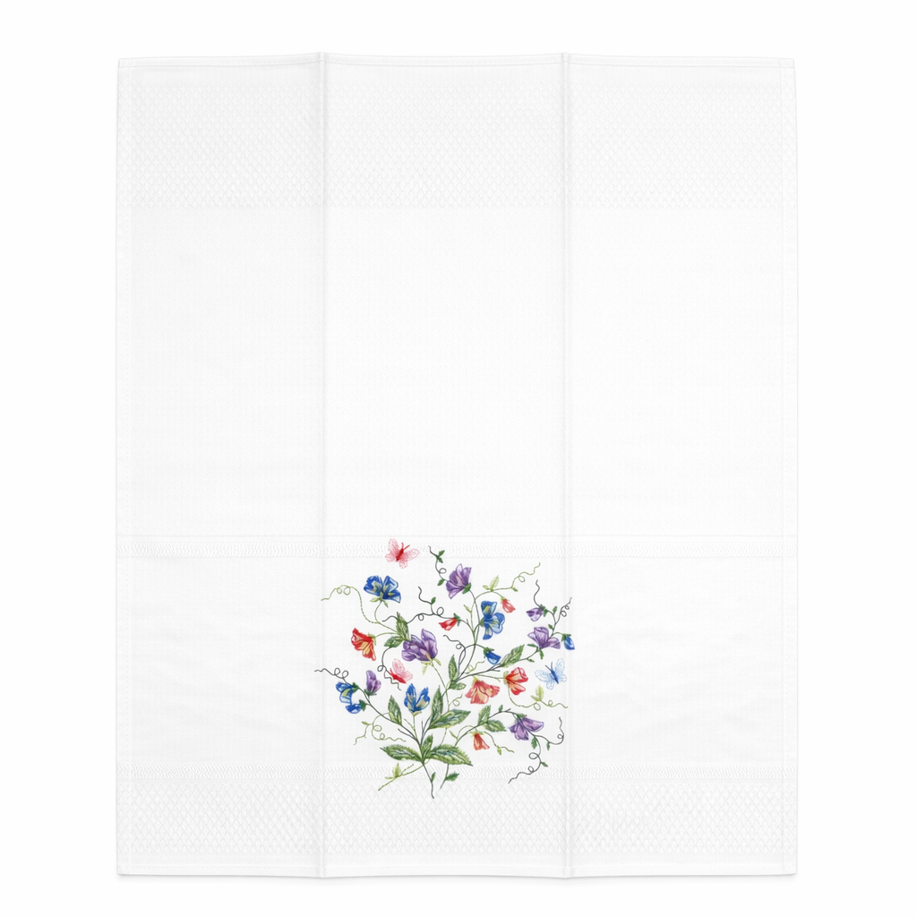 Featuring a graceful floral design with vibrant blossoms and delicate butterflies, this towel captures the beauty of a blooming garden in a refined and artistic way. The intricate embroidery showcases flowing vines and soft, colorful details that stand out beautifully against the crisp white cotton background.