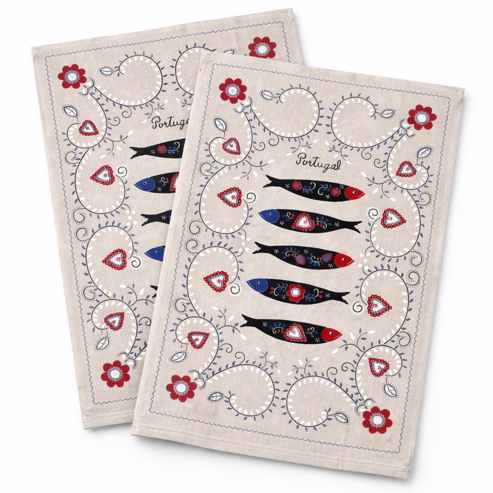 Featuring traditional sardines surrounded by folk-inspired floral and heart motifs in vibrant red and blue, this design captures the warmth and artistry of Portuguese culture. The natural cotton background enhances the bold detailing, making each towel a standout accent piece.