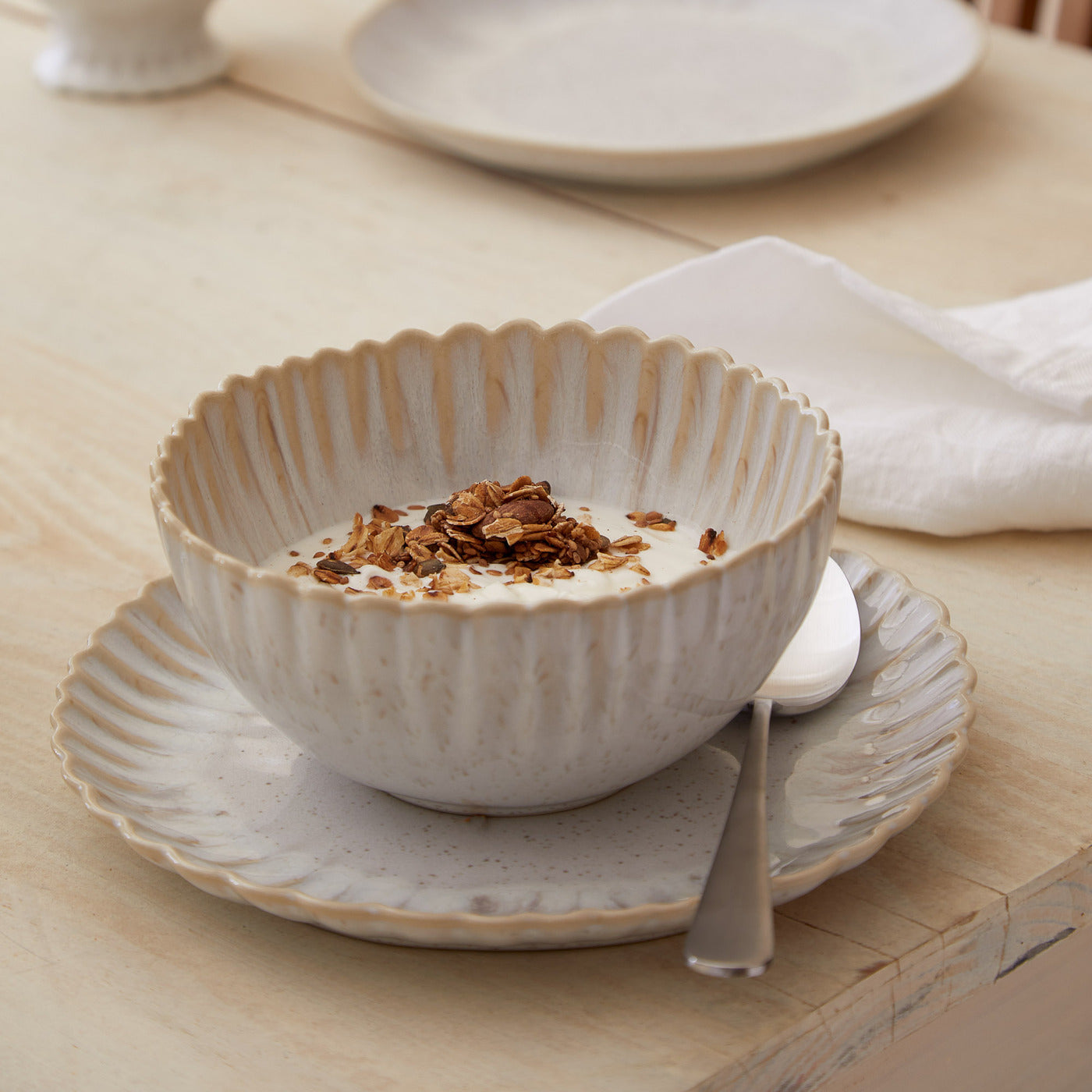 The Mallorca collection captures the natural landscape of the famous Mediterranean island, a haven of turquoise waters, soft golden sands, and impressive cliffs. Mallorca shares its DNA with the Eivissa collection, featuring reactive glazes of sand-beige and sea-blue patterns. Yet, its soft and scalloped edges suggest a more exquisite look. Combine both shapes for a casual and eclectic look.