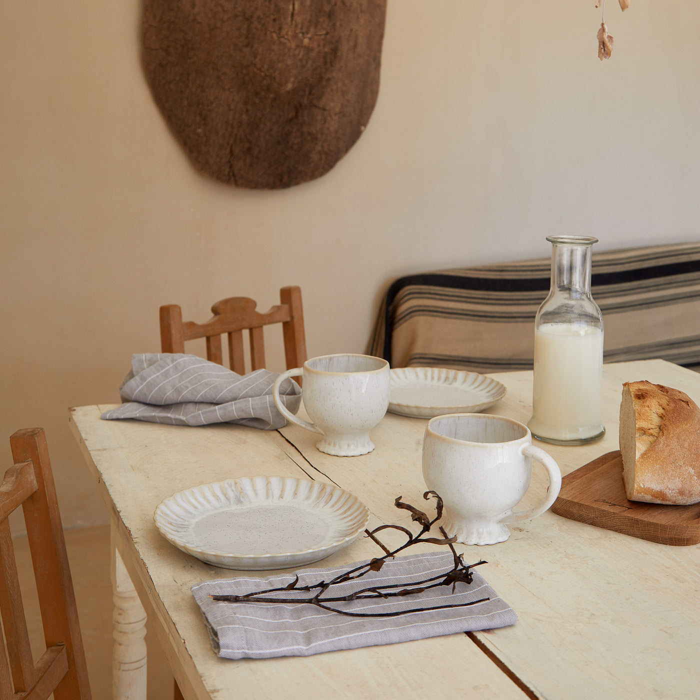 The Mallorca collection captures the natural landscape of the famous Mediterranean island, a haven of turquoise waters, soft golden sands, and impressive cliffs. Mallorca shares its DNA with the Eivissa collection, featuring reactive glazes of sand-beige and sea-blue patterns. Yet, its soft and scalloped edges suggest a more exquisite look. Combine both shapes for a casual and eclectic look.