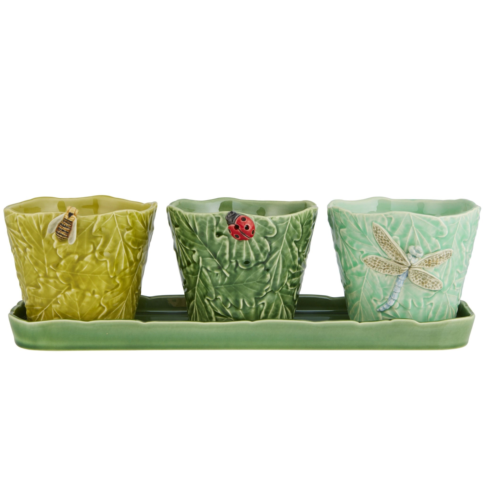 A set of vases, covered by leaves, over which six terrestrial and flying insects are strolling around. They are: the snail, the frog, the lizard, the dragonfly, the bee and the ladybug. The vase, insect and plant, thus create the harmony of an insect garden