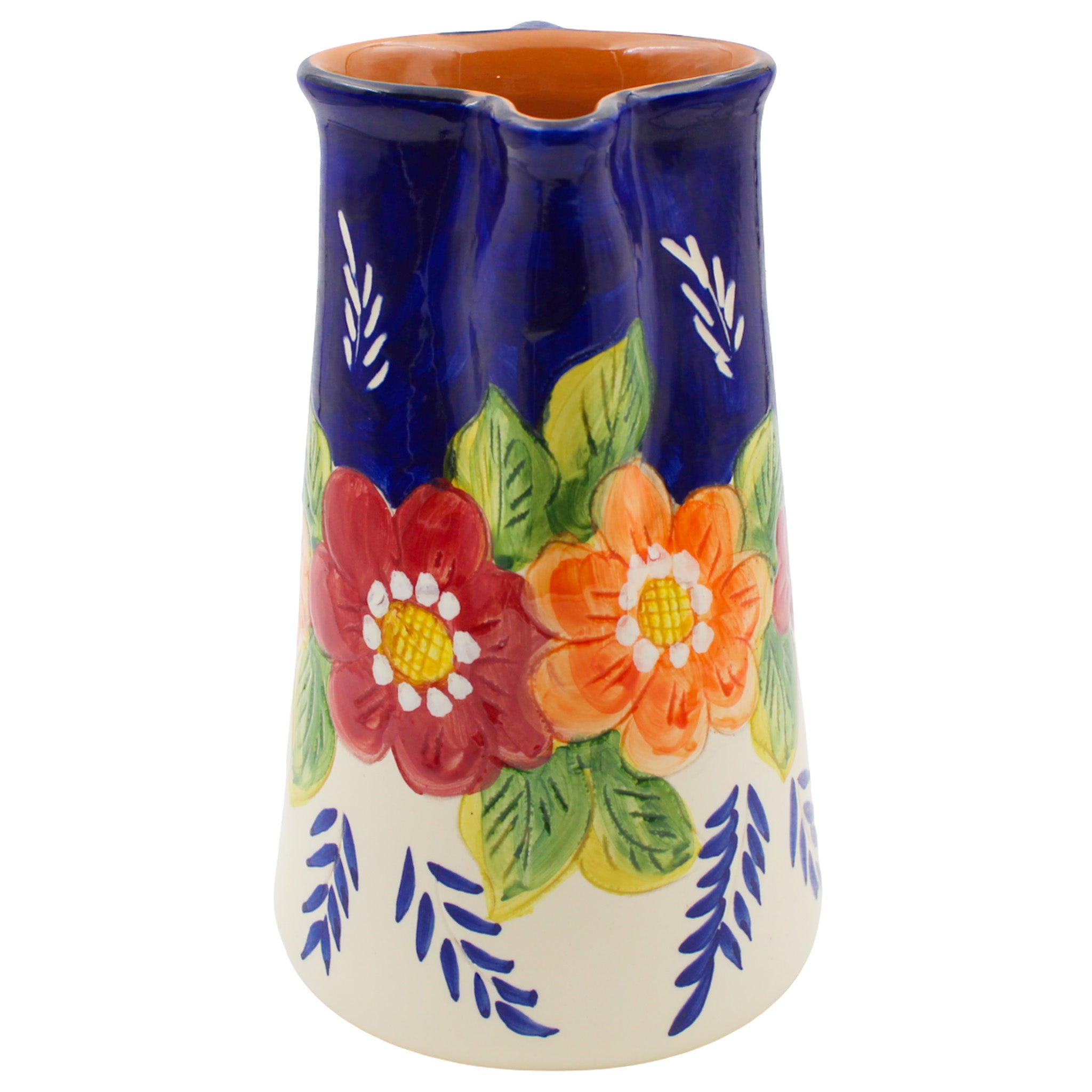 Bring the charm of a Portuguese garden to your table with this Xarazarte Floral Pitcher, beautifully hand-painted with vibrant blooms over a traditional terracotta base. Each piece is shaped and decorated by skilled artisans in Portugal, showcasing a colorful floral motif and rich cobalt blue glaze that highlights the region's celebrated pottery heritage. Its generous 40 fl oz capacity makes it perfect for serving water, sangria, or fresh juices, while the terracotta body adds rustic warmth and authenticity to any meal.