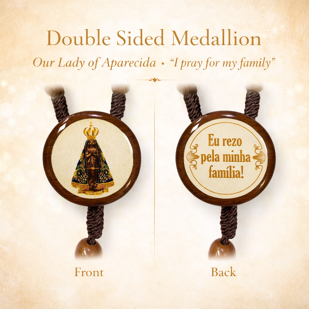 - Our Lady of Aparecida Double-Sided Medallion: Front features a full-color image of Nossa Senhora Aparecida; back engraved with "Eu rezo pela minha família" — a deeply personal message for Brazilian Catholic families.
