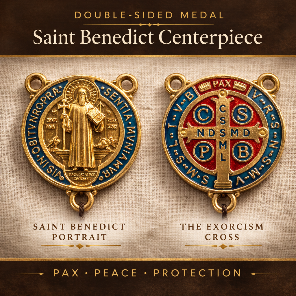 • Double-Sided Saint Benedict Medal: Striking enamel centerpiece medal featuring the Saint Benedict portrait on one side and the Exorcism Cross with PAX inscription on the reverse, set in a gold-tone frame with vibrant red and teal enamel detail.