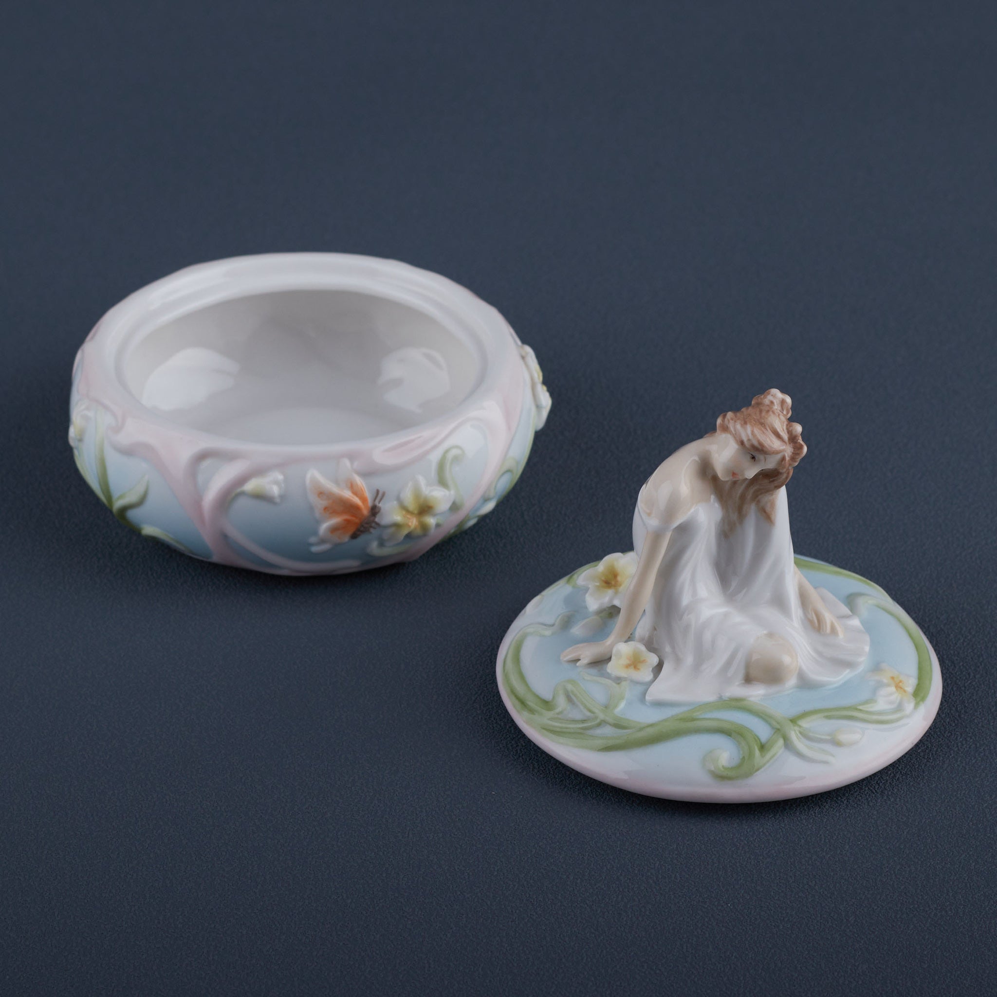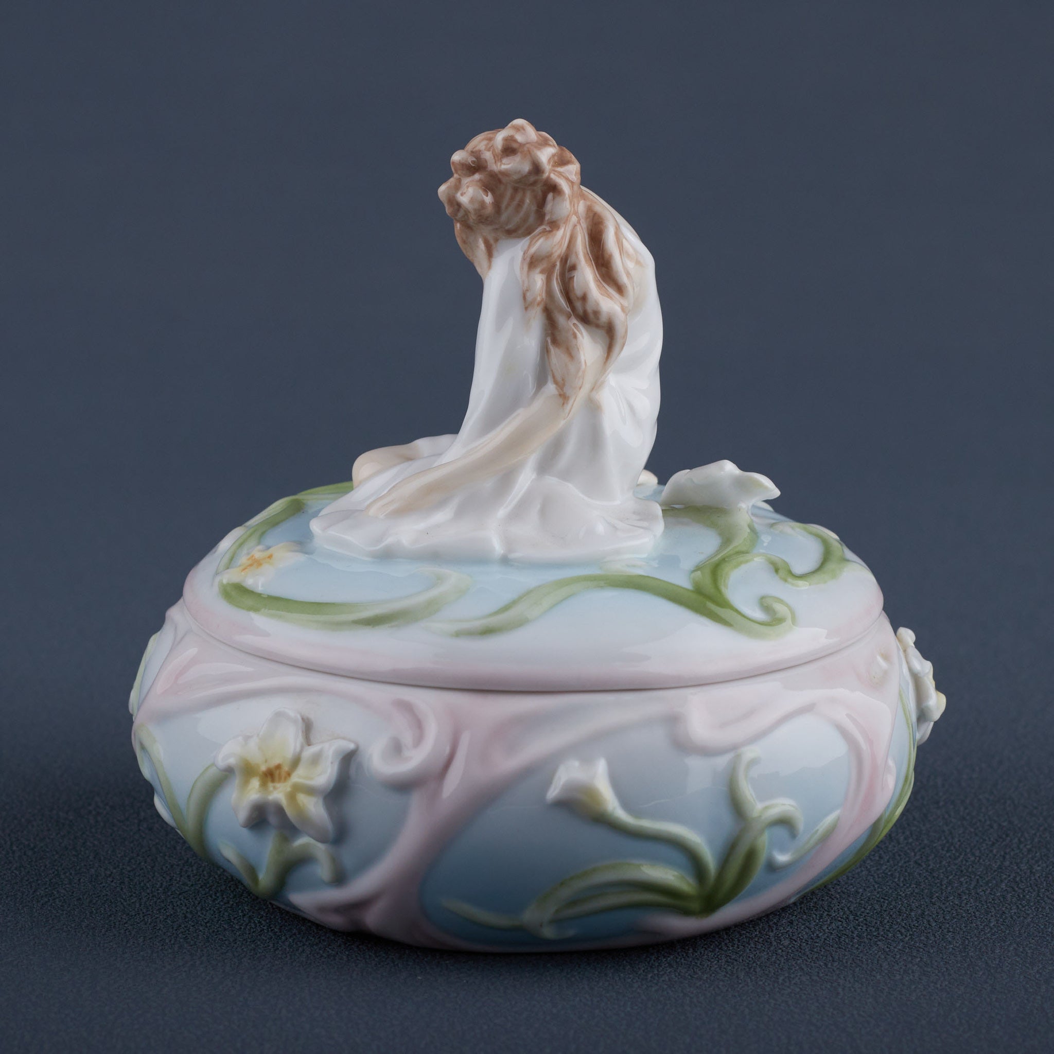 - Elegant Figurine Lid: Features a graceful seated lady in flowing white attire, sculpted with soft facial details and gentle movement