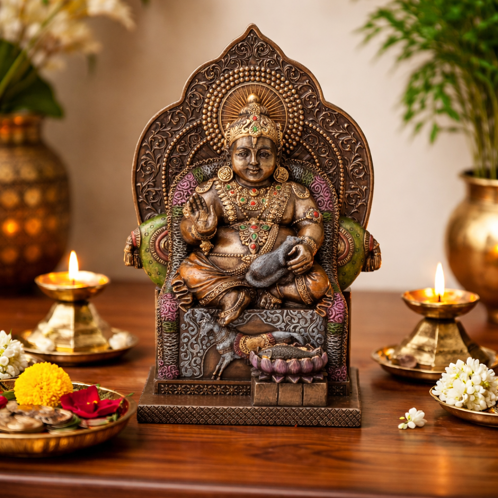 - Lord Kubera Design: Depicts Lord Kubera, the Hindu deity of wealth and prosperity, seated on an ornate throne with traditional symbolic elements.